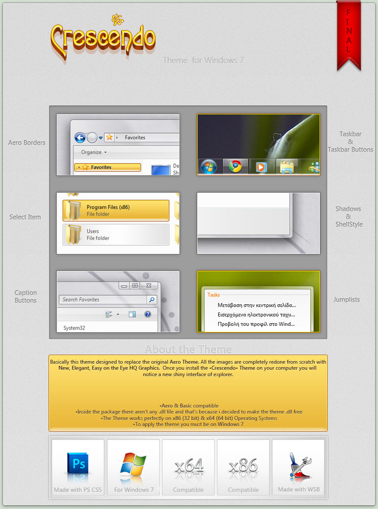 Crescendo is an excellent Visual Styles developed for Windows 7. Crescendo Visual Styles is a Nature Visual Styles. Windows7themer.com provides you the best Windows 7 Visual Styles which is available for free download. Crescendo is one of the most downloaded Visual Styles for Windows 7.