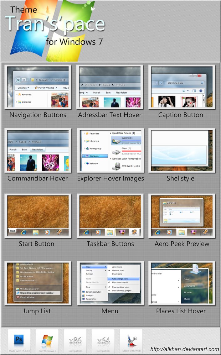 Transpace is an excellent Visual Styles developed for Windows 7. Transpace Visual Styles is a Applications Visual Styles. Windows7themer.com provides you the best Windows 7 Visual Styles which is available for free download. Transpace is one of the most downloaded Visual Styles for Windows 7.