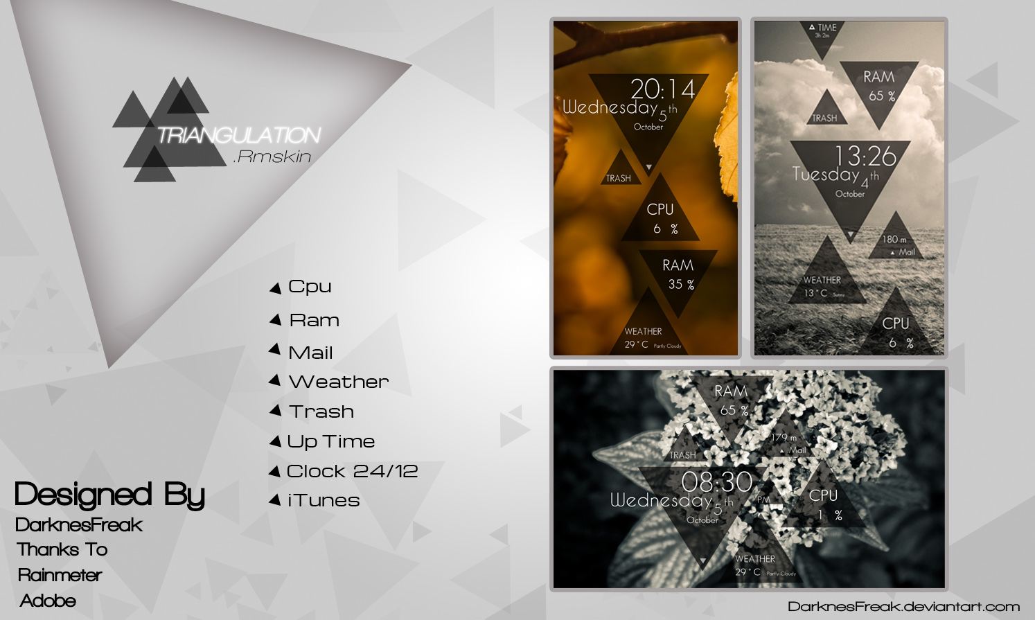 Triangulation is an excellent Rainmeter Skins developed for Windows 7. Triangulation Rainmeter Skins is a Technology Rainmeter Skins. Windows7themer.com provides you the best Windows 7 Rainmeter Skins which is available for free download. Triangulation is one of the most downloaded Rainmeter Skins for Windows 7.