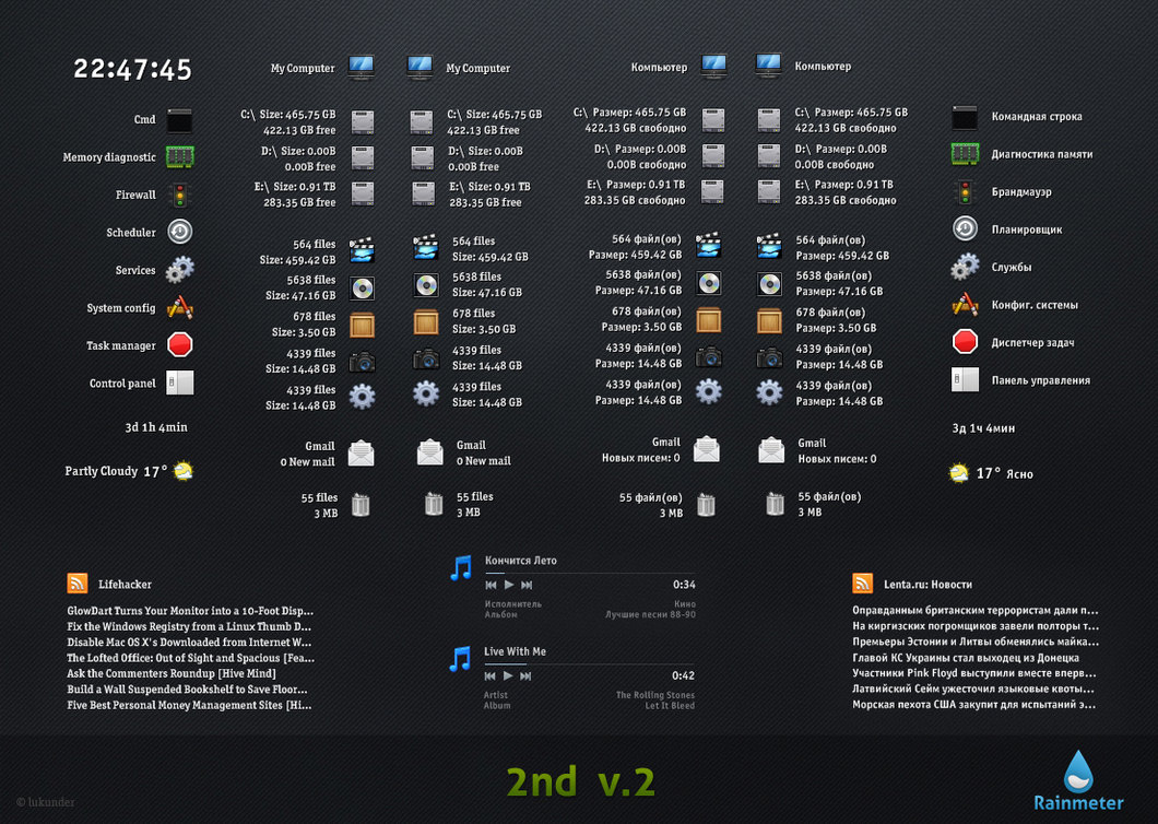 V2 is an excellent Rainmeter Skins developed for Windows 7. V2 Rainmeter Skins is a Technology Rainmeter Skins. Windows7themer.com provides you the best Windows 7 Rainmeter Skins which is available for free download. V2 is one of the most downloaded Rainmeter Skins for Windows 7.