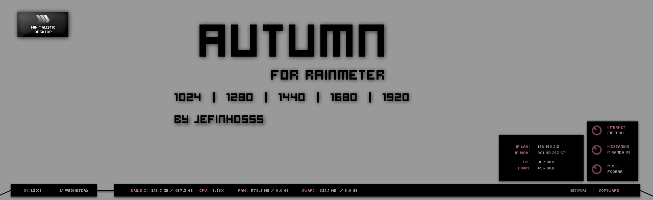 Autumn Grey Black is an excellent Rainmeter Skins developed for Windows 7. Autumn Grey Black Rainmeter Skins is a Technology Rainmeter Skins. Windows7themer.com provides you the best Windows 7 Rainmeter Skins which is available for free download. Autumn Grey Black is one of the most downloaded Rainmeter Skins for Windows 7.