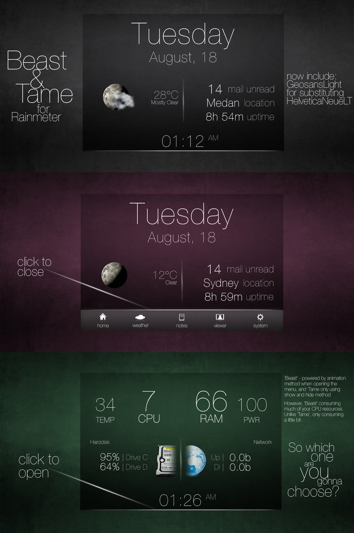 Beast And Tame is an excellent Rainmeter Skins developed for Windows 7. Beast And Tame Rainmeter Skins is a Technology Rainmeter Skins. Windows7themer.com provides you the best Windows 7 Rainmeter Skins which is available for free download. Beast And Tame is one of the most downloaded Rainmeter Skins for Windows 7.