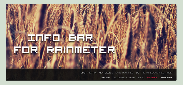 Info bar is an excellent Rainmeter Skins developed for Windows 7. Info bar Rainmeter Skins is a Technology Rainmeter Skins. Windows7themer.com provides you the best Windows 7 Rainmeter Skins which is available for free download. Info bar is one of the most downloaded Rainmeter Skins for Windows 7.