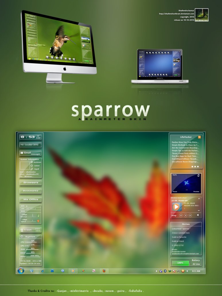 Sparrow is an excellent Rainmeter Skins developed for Windows 7. Sparrow Rainmeter Skins is a Nature Rainmeter Skins. Windows7themer.com provides you the best Windows 7 Rainmeter Skins which is available for free download. Sparrow is one of the most downloaded Rainmeter Skins for Windows 7.