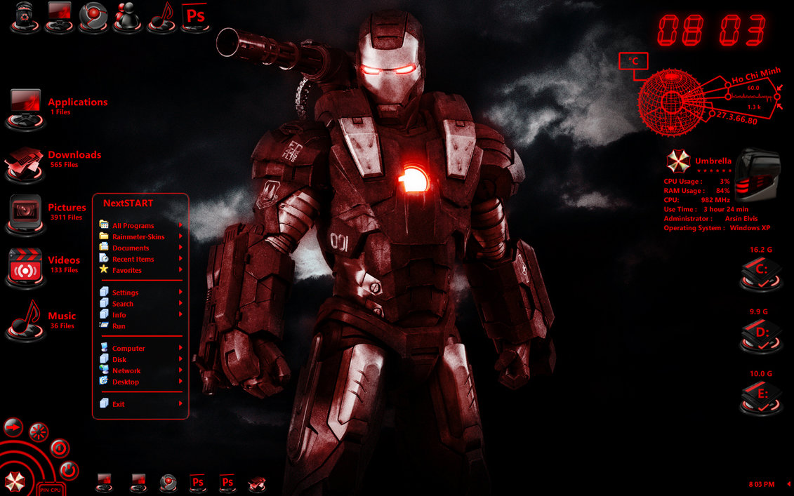 War Machine is an excellent Rainmeter Skins developed for Windows 7. War Machine Rainmeter Skins is a Technology Rainmeter Skins. Windows7themer.com provides you the best Windows 7 Rainmeter Skins which is available for free download. War Machine is one of the most downloaded Rainmeter Skins for Windows 7.